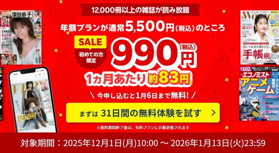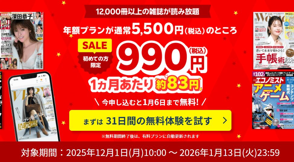 | 年間990円 キャンペーン | 年間プランが 82%OFFの990円 | 特設ページから 年間プランで 申し込み | 2026年 1月13日まで |